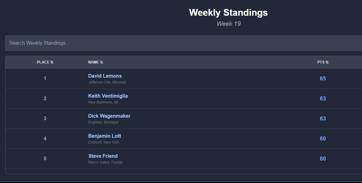 After the six NFL Wildcard games, Teddy Overton from Claremore, OK continues to lead the PFCC field with 1072 points. Hot on Teddy's heals are 5 bone earners in the form of John Zittel (2016 Silver), Mark Plate (2024 Bronze), Jane Banks (2019 Champion) and another of the Overton Clan named Jeffrey (2023 Silver). The only player in the Top 6 without a bone (besides Teddy) is dirty-dawg powerhouse Matthew Brady who is in 5th place 20 points off the mark.