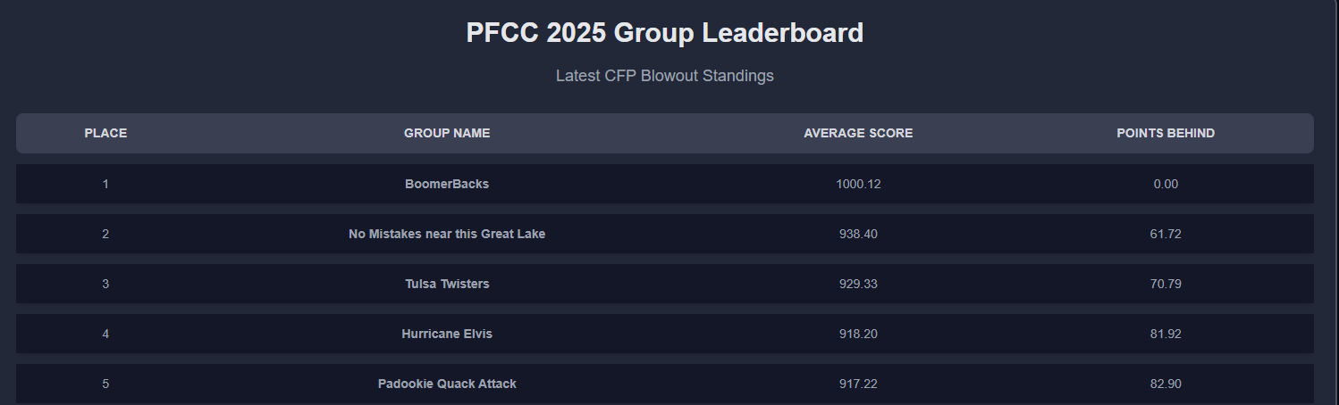 We have a close battle in group competition, as we have had all year. The Border War Still Lives in KC is currently in the lead with 937.40 points, but Stratus-Faction Guaranteed is just 7.69 points back. Water Warriors, BoomerBacks and The Florida Dummies-Legacy are likely all in contention depending on how the rest of the CFP plays out.
